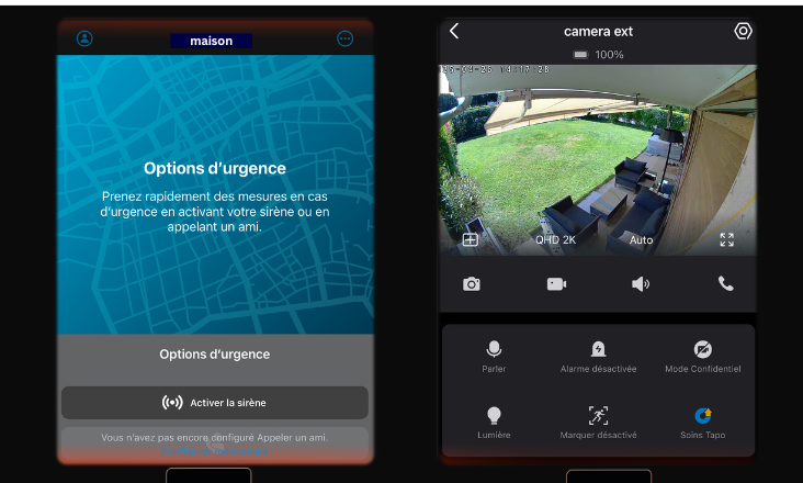Voici deux exemples de ce que vont proposer vos applications de caméras en cas de problème. Deux exemples ci-dessous pour des modèles de caméras à gauche, la marque Arlo vous proposera d'appeler un ami ou d'activer la sirène d'alarme et à droite, la marque Tapo d'activer l'alarme de la caméra.