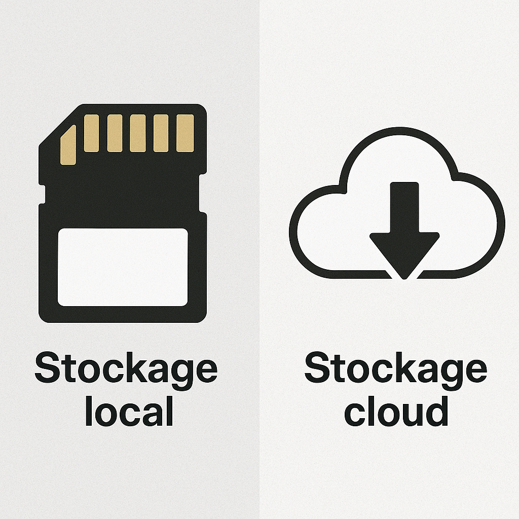 - Stockage local (carte SD intégrée) : simple et sans abonnement, mais en cas de vol de la caméra, les images peuvent être perdues.